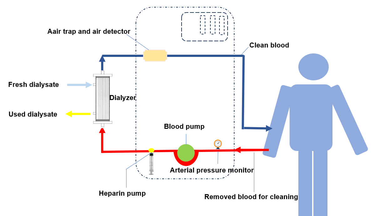 A hemodialysis machine is a complex medical device that is used to perform hemodialysis, a treatment for patients with kidney failure. The machine works by removing waste products and excess fluid from the patient’s blood and maintaining the balance of electrolytes. Here’s a simplified explanation of how a hemodialysis machine works: